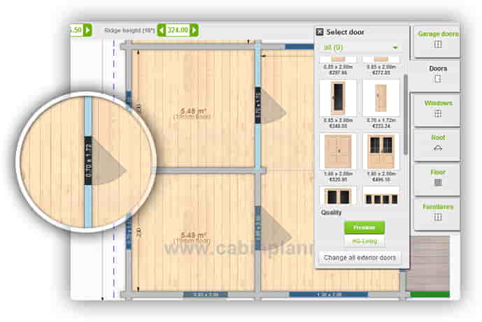Cabinplanner© provides its user possibility of choosing different types of wood thickness, roof style, windows and doors and many other technical features which makes our configurator very convenient and versatile. Our configurator has user friendly interface and is made for intuitive use.  We constantly work on developing our configurator to offer even more options and possibilities.